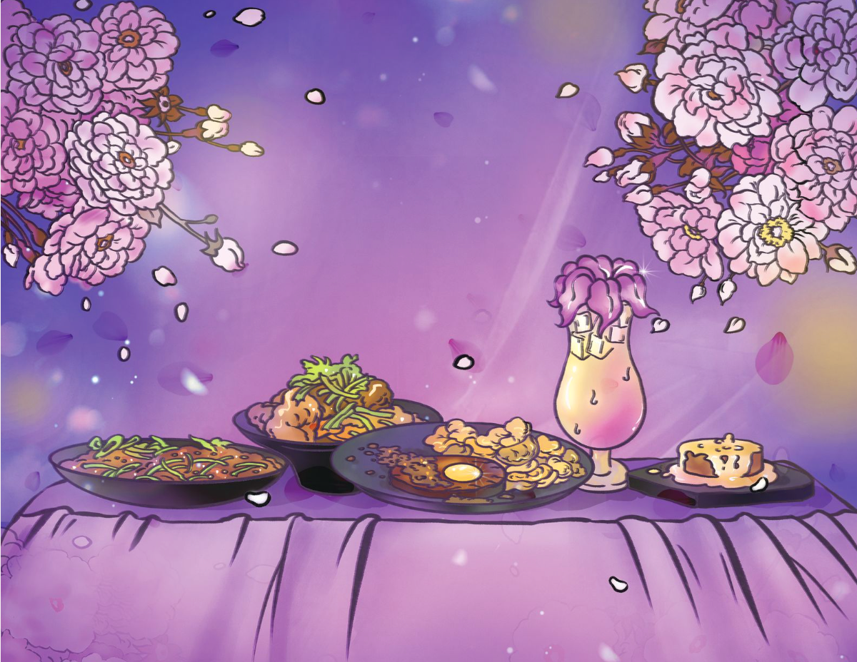 At the forefront stands a pandan tree, a nod to the commonly used ingredient in Asian cuisine, setting the stage for Southeast Asian vibes with palm leaves and a small boat in the background. As the menu progresses, the ambiance shifts from dusk to night, guiding you through the neon-lit streets of Tokyo.